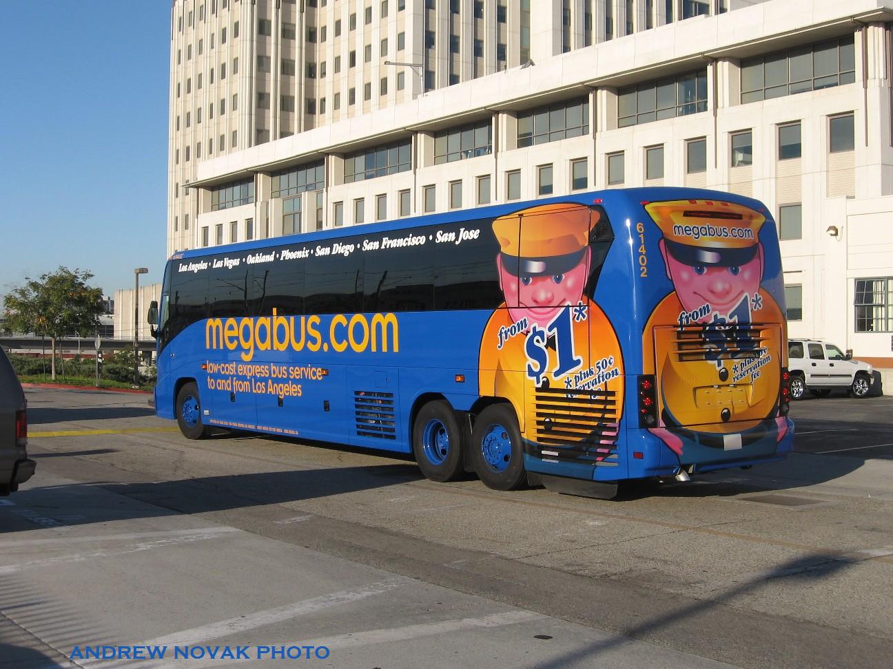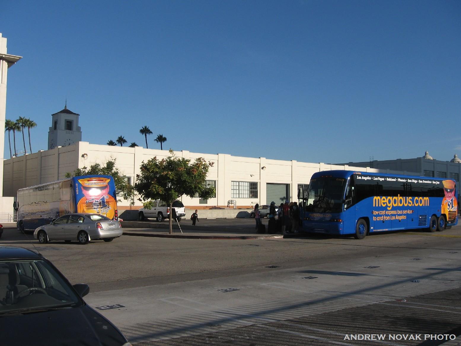 2 J4500s at the Megabus stop at Los Angeles Union Passenger Terminal on August 13, 2007 shortly after the service began. (Andrew Novak Photo)
